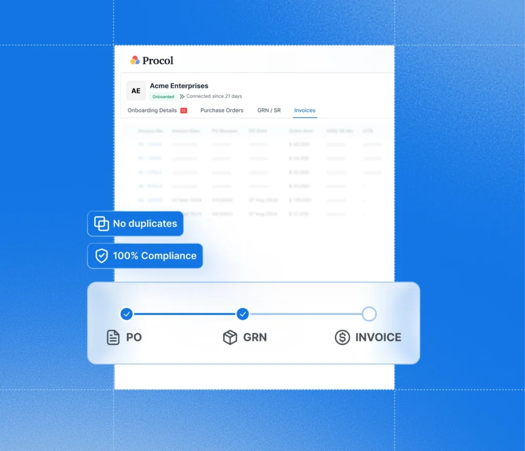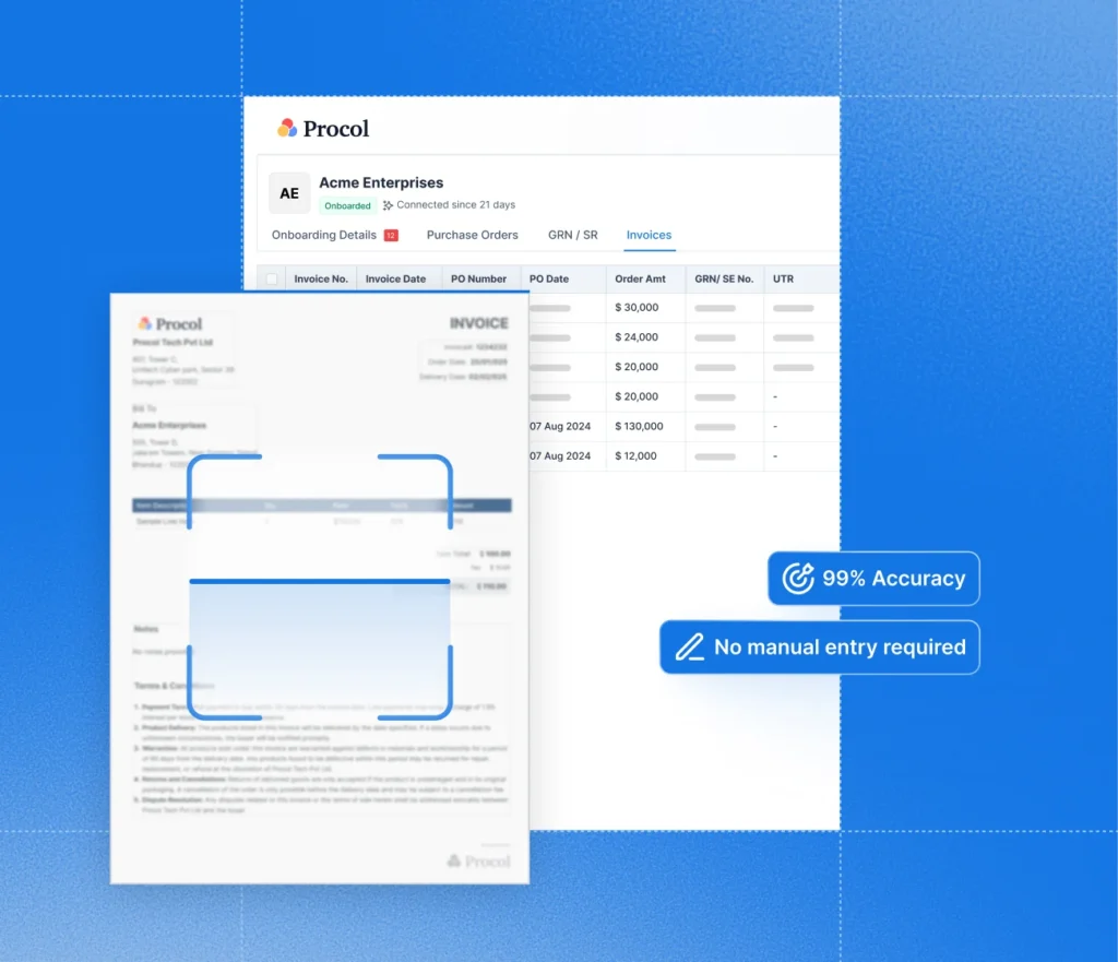 Procol’s AI-powered OCR extracts key details like vendor name, PO number, tax values, payment terms, etc., automatically with over 99% accuracy. No need for manual entry, thus reducing human error.