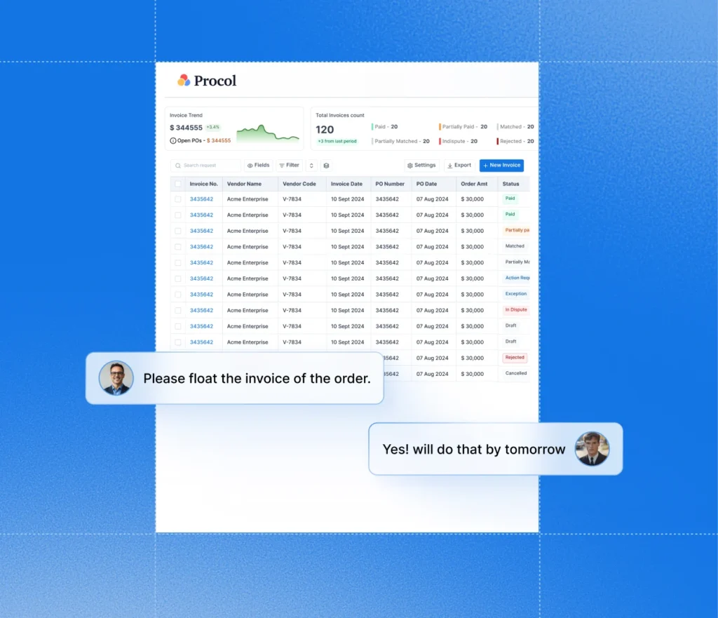 Enable suppliers to submit invoices, check payment status, and resolve queries directly through Procol’s self-service vendor portal, no endless email threads and missed calls.