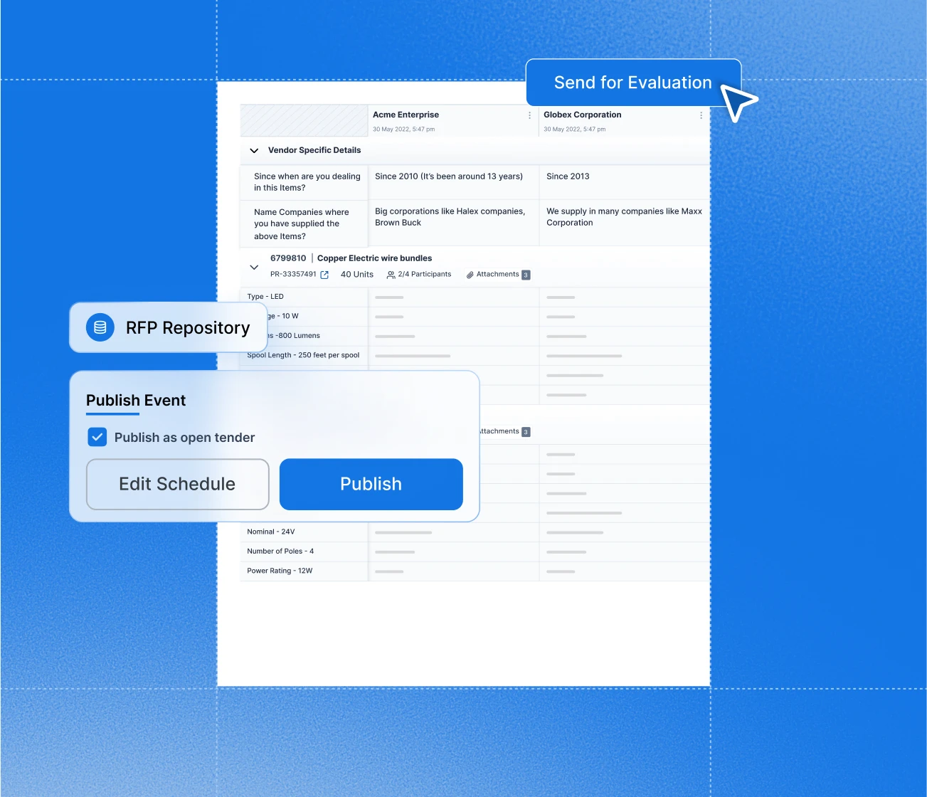 No more back and forth on email trails. Single sourcing platform to collaborate seamlessly with internal teams on RFP authoring and suppliers to review and finalize RFPs.